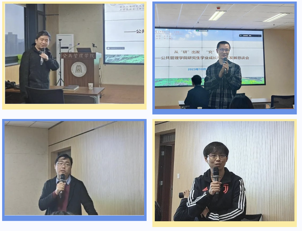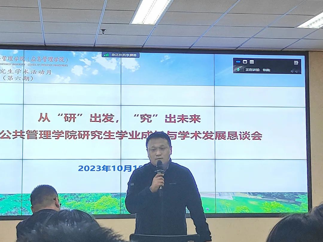 为进一步完善我院研究生教育、教学以及管理工作,促进教师充分了解学生在学术与生活中遇到的问题、想法、意见,并针对学生问题给予相关建议,搭建学生与学校、学生与学院沟通交流的桥梁。2023年10月18日,565net必赢2023至2024学年正学恳谈会(研究生专场)于西学楼1305会议室召开,腾讯会议同步进行线上会议。本次会议以“从‘研’出发,‘究’出未来”为题,校研究生院副院长冯建涛、我院党委副书记韩杰、科研副院长翟绍果、社会保障学系副主任聂建亮、公共政策与管理系主任周文光、人力资源管理系主任刘鹏、公共信息资源管理系主任王铮、学院团委书记陈露、研究生秘书邢莉以及全院博士、硕士研究生参与本次会议,会议由翟绍果教授主持。