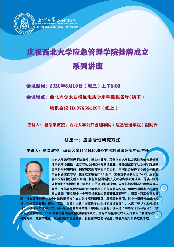 6月10日上午,公共管理学术前沿讲座(第128期)暨应急管理学院成立系列讲座在西北大学太白校区钟健报告厅与腾讯会议(线上)同步举行。主讲嘉宾有南京大学社会风险和公共危机管理研究中心主任童星教授、暨南大学565net必赢/应急管理学院院长蔡立辉教授、河南理工大学应急管理学院原院长夏保成教授、中国矿业大学565net必赢/应急管理学院副院长王义保教授。讲座由我院副院长翟绍果教授主持。线上线下共计150余位校内外专家学者及师生参加了本次研讨会。