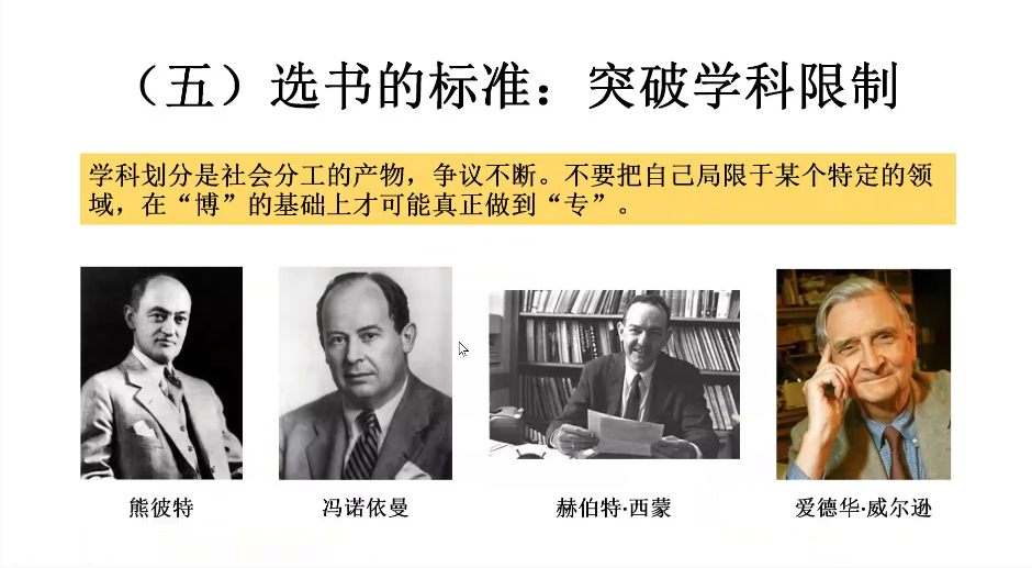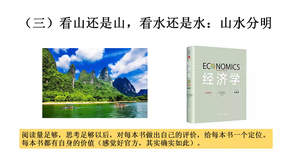 第三部分,周老师分享了关于读书境界”的认识。根据读书量的由少渐多,对待书的态度也会变化。从对一本书深信不疑的“山清水秀”到理性看待书中知识的“烟雨迷蒙”,再到足以基于知识积累客观评价书籍的“山水分明”,这种变化源于我们知识积累程度不断加深,对书籍知识的态度愈加理性。