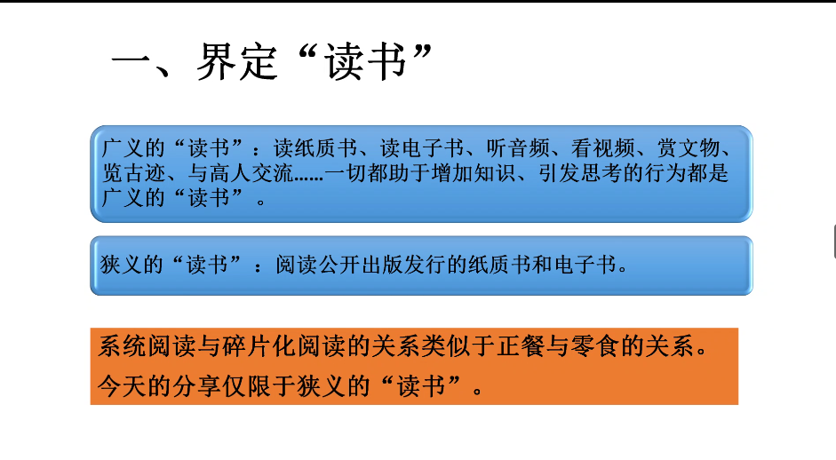 周文光老师围绕这一主题,从读书的界定、读书的目的、读书的境界和读书的方法四个方面进行分享。第一部分,周文光老师通过自身阅读经验,介绍了我们进行跨学科领域阅读的意义。周老师首先界定了本次分享的“读书”概念:阅读公开出版发行的纸质书和电子书。随后,他指出了系统阅读方式和碎片化阅读方式的区别与联系,并着重介绍了系统阅读的重要性。