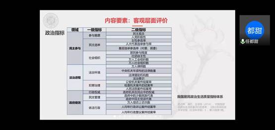 任都甜老师围绕“社会治理标尺要素:构建人民‘美好生活’体验尺度”这一主题展开分享。她的分享内容主要包括四个方面:社会治理标尺要素的理论和现实背景、美好生活体验度评价的内容要素、美好生活体验度评价的现状与问题甄别、美好生活体验度评价的指标体系构建。