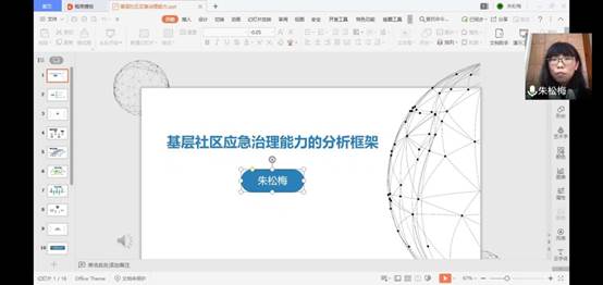 朱松梅博士的分享主题是“基层社区应急治理能力的分析框架”。她从风险常态化的社会背景、能力及能力的构成两个方面展开讲解。她认为,衡量社区应急治理能力可以从治理主体、治理意愿、治理资源三个方面入手。在治理主体层面,基层社区应急治理主体呈现差序格局;治理意愿即为行为主体(或者集合)的认知,主要包括风险认知、责任认知及合作认知;在分析行为主体(及其集合)掌握的资源时,可以从制度资源、物质资源、财务资源、人力资源四个方面入手。