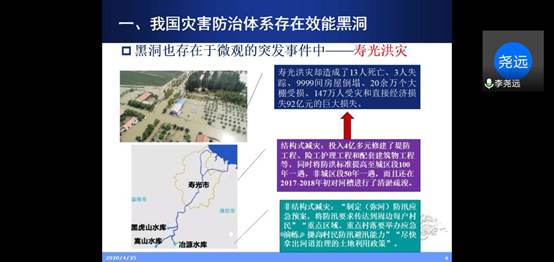 李尧远教授此次分享的主题是“我国灾害防治体系的效能黑洞及其治理”。他从我国灾害防治体系存在效能黑洞、我国灾害防治体系效能黑洞的成因、我国灾害防治体系效能黑洞的治理三个方面展开讲解。李尧远老师认为我国灾害防治体系效能黑洞的成因主要包括“堤防效应”的逆向影响、防灾体系的超危、高危漏洞或中低危漏洞的交叠效应、结构式减灾和非结构式减灾缺乏耦合三点。在治理时可从唤醒各类责任者的责任心和风险意识、建立系统性制度的查漏补缺机制、建立结构式减灾和非结构式减灾的耦合机制三个方面入手。