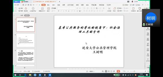 延安大学王树明老师围绕“基本公共服务均等化的视角下:社会治理工具的分析”这一主题展开讨论。他分别从研究背景、公共服务多元化供给主体分析、实现公共服务均等化的社会治理工具要素分析、公共服务多元化供给的问题与溯因以及解决路径等五个方面展开讲述。