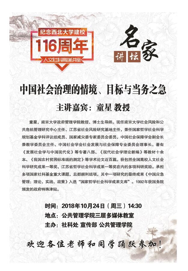 上一条:童星教授做客我校名家讲坛 下一条:西北大学名家讲坛暨公共管理学术前沿讲座(第105期)——中西文化传统与现代国家治理