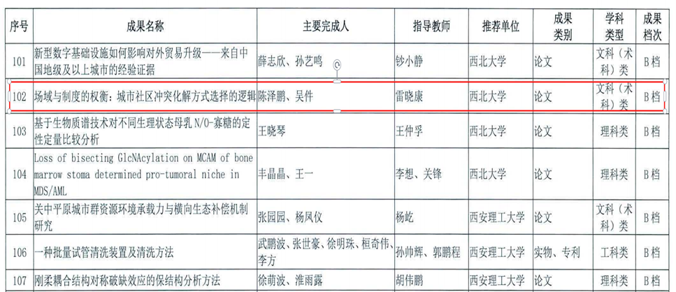 近日,陕西省教育厅、陕西省学位委员会公布了陕西省第七届研究生创新成果展高质量成果名单。我院2021级博士研究生陈泽鹏(导师:雷晓康教授)的《场域与制度的权衡:城市社区冲突化解方式选择的逻辑》一文获评文科类B档成果。
